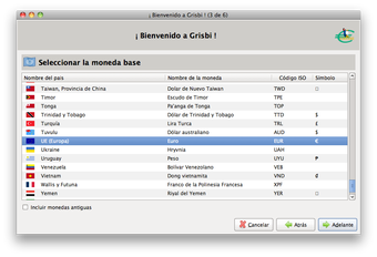 Una de las ventajas de Grisbi es que se pueden añadir gastos en diferentes monedas, hay centenares de ellas disponibles, e incluso puedes crearte tu propia moneda.